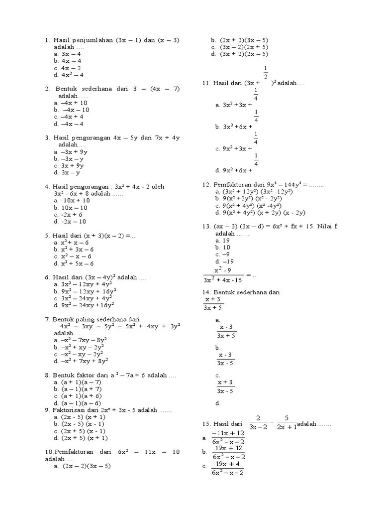 5y2 + 4xy + 8y d. Mengamati perkalian dan pembagian bentuk aljabar yang disajikan dalam bentuk tabel. 16y2 + xy + 5y c. 5y2 + 4xy + 8y d. 16y2 + xy + 5y c. Mari kita lihat soal tersebut. Jadi, bentuk sederhana dari 9 y squared minus 4 x y plus 5 y plus 7 y squared plus 3 x y adalah 16 y squared minus x y . Uji kompetensi 3 merupakan bagian akhir dari bab bentuk aljabar yang terdapat.