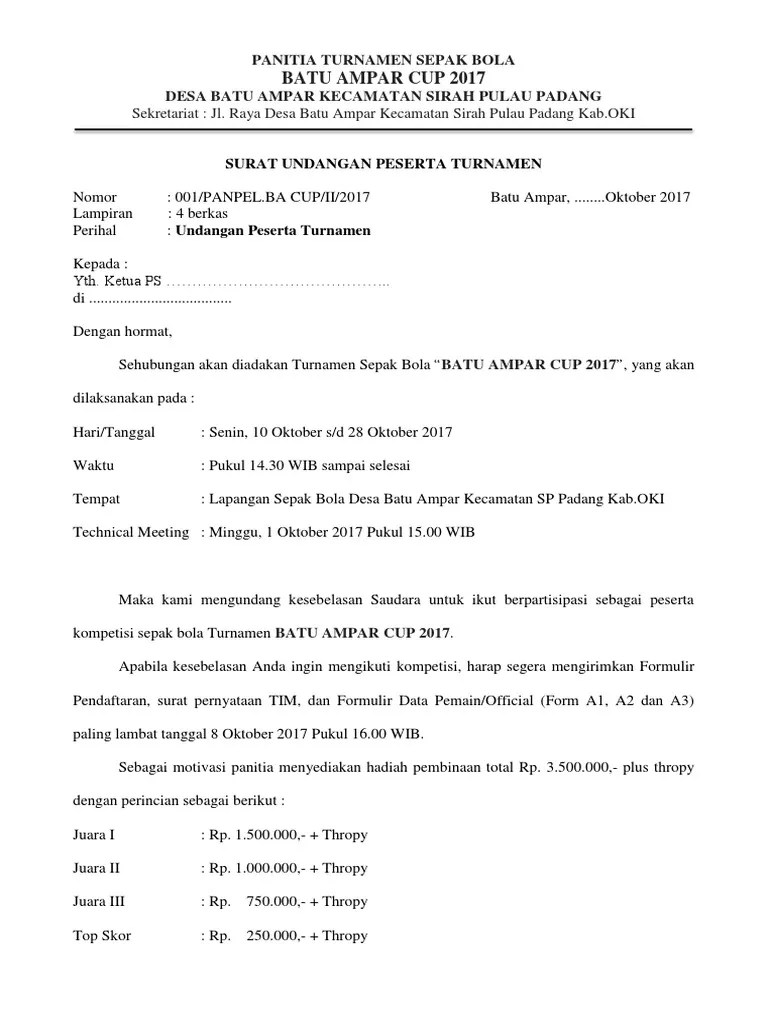 Contoh surat undangan sepak bola panitia pertandingan sepak bola khitanan suhendra putra ke 2 bapak dulgani dan ibu sahati alamat.